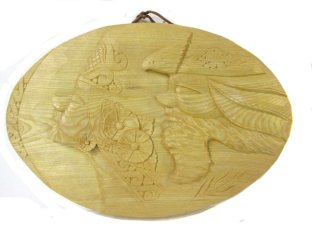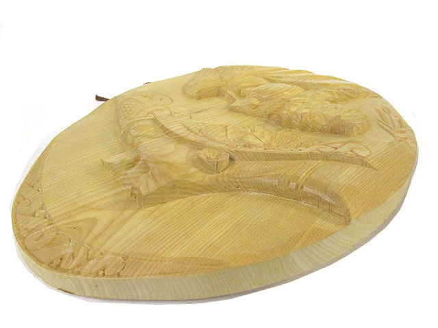 れた横長の楕円状の木彫りの壁掛けとなります。