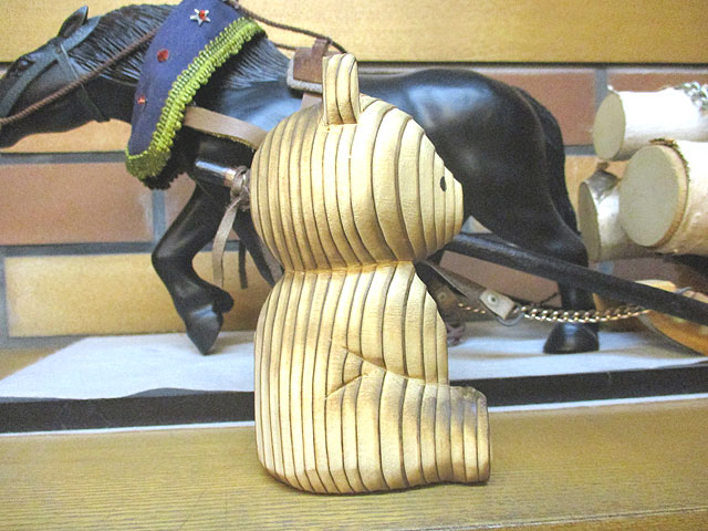 後ろに写っているのはバチ引きの農耕馬の彫り物ですが、これは非売品にして