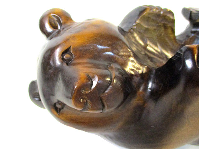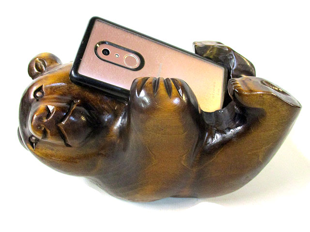スマホをお腹に置いた状態で寝転んでいるように見える木彫り熊で、見たまんまのネーミングで「スマホ抱き寝転び熊」 その茶色です。
