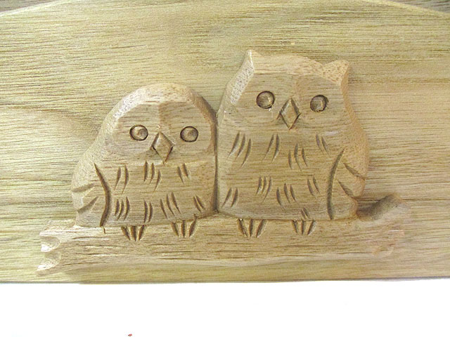 つがいのふくろう(ふくろう)を彫り物として取り付けた木製の卓上状差しであるスタンドラックになります。