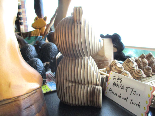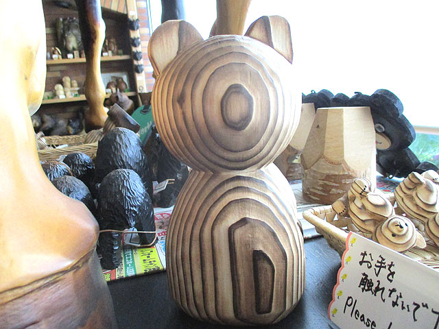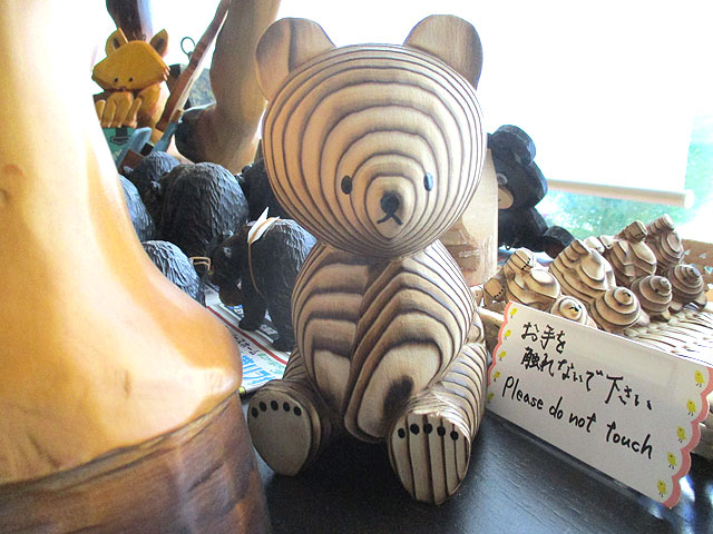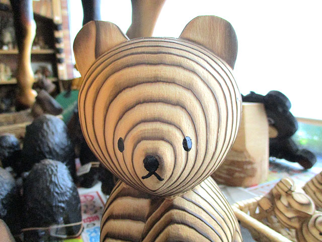 撮影場所は店内の巨大馬の足元なので、画面左に馬の足首あたりが写っていて、右側のカゴには目描きして乾かしている熊ボッコ小が写ってます。 目鼻を入れた熊ボッコちゃんは、こんな感じで乾かしておりますので、2~3日そのままです♪