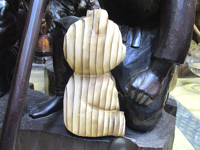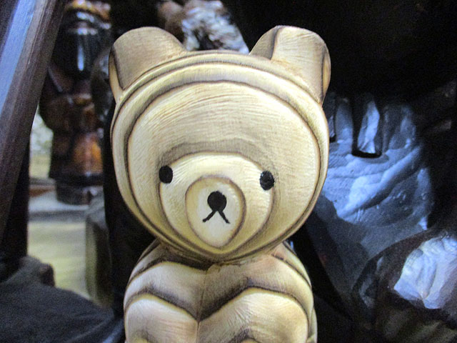 鼻の頭から2つ目と3つ目の年輪幅があいている(間隔があいているの意味)のがわかりますが、熊ぼっこを複数見ているコアの方々には、ご説明の中で、木の成長具合が木々によって異なるので、年輪幅の大きいものや小さいものが出てきます!とのお伝えをしておりますが、このNO137特大のように「ここだけ広い?」という子も出てきます。目を凝らしてよ~く見てみると、うっすら線(年輪線)が見えます。彫ってからの工程の事情によってですが、この部分の線のまわりを削ってペーパー掛けの方がよい!と判断をされた際は、このような誕生の熊ボッコとなります。都度、個々に異なるので一概には申せませんが、それが「熊ボッコ」です!