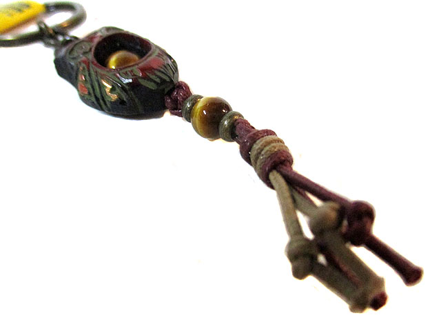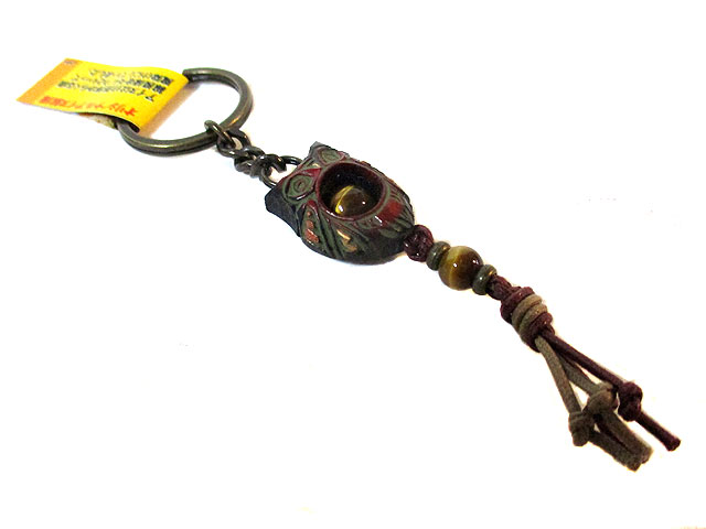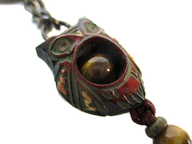 中の珠は編み紐で繋いでおり、ふくろう本体の下に飛び出ている部分にも虎目石との黄土色の珠が1個ついております。