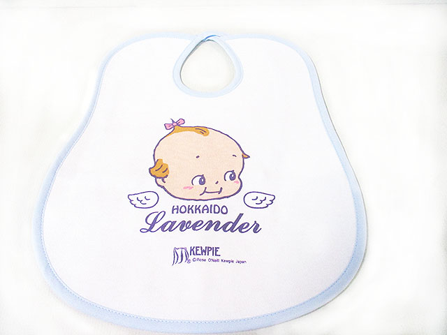 以前に北海道限定として北海道内のお土産取り扱い店さんで販売されていたことのあるキャラクーシリーズの品で「ラベンダーキューピー」のよだれかけとなります。