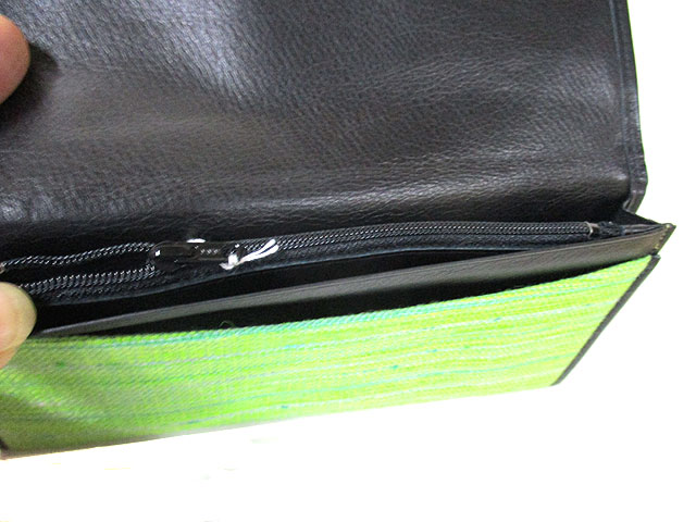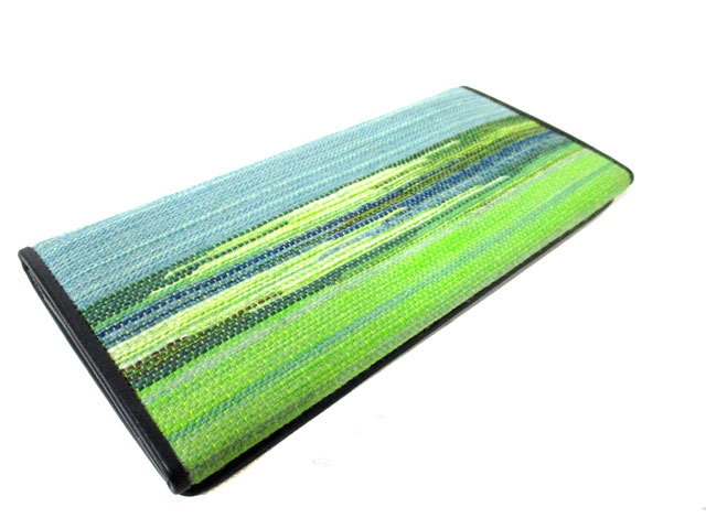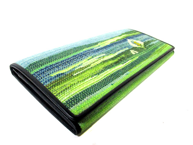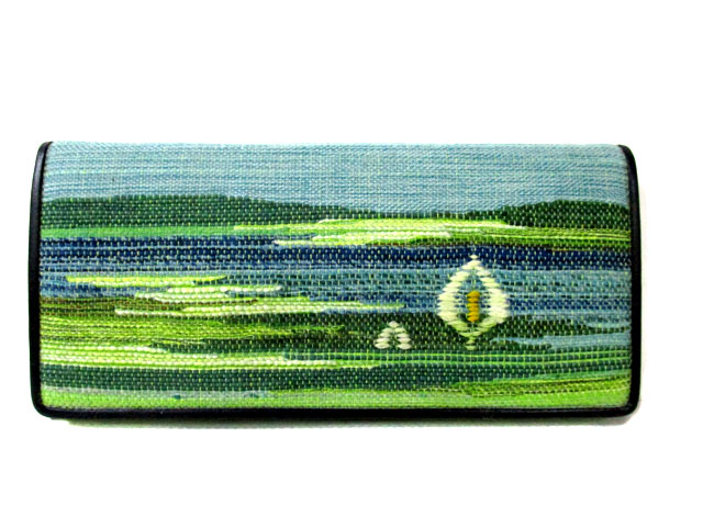 ユーカラ織の作品タイトルのついた「水芭蕉(みずばしょう)」の柄のお札を畳まないで入れれる形状の横長(長角)タイプの札入れです。