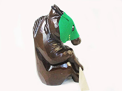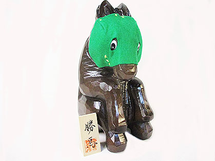 木彫り馬をユーモアある雰囲気にお座りさせているポーズで、それを
