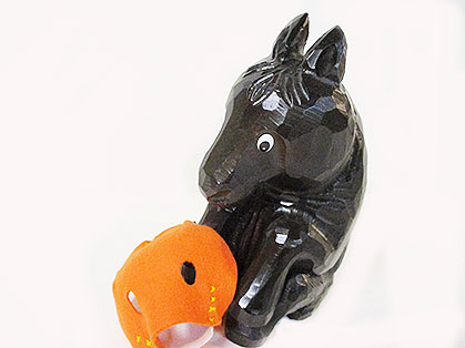 木彫り馬をユーモアある雰囲気にお座りさせているポーズで、それを