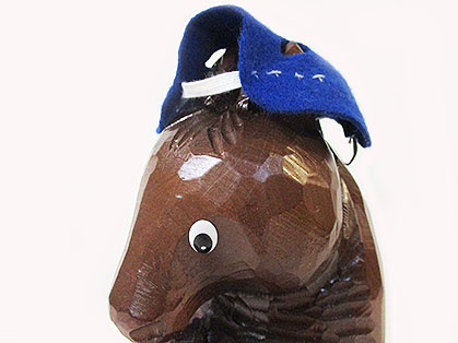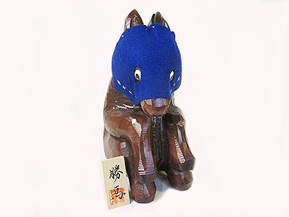 木彫りのお馬さんがお座りさせたポーズでくつろいでいる品です。