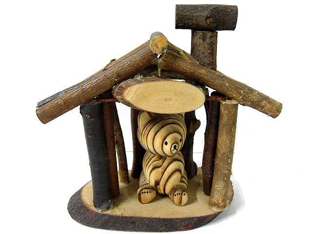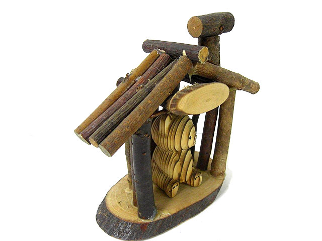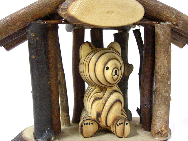木の枝をカットしたものを組み合わせ、貼り合わせて山小屋風にしたものに