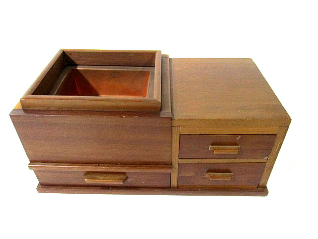 その箱火鉢に付属の引き出しを付け、物入兼用にした横長の火鉢。関東火鉢もしくは江戸長火鉢