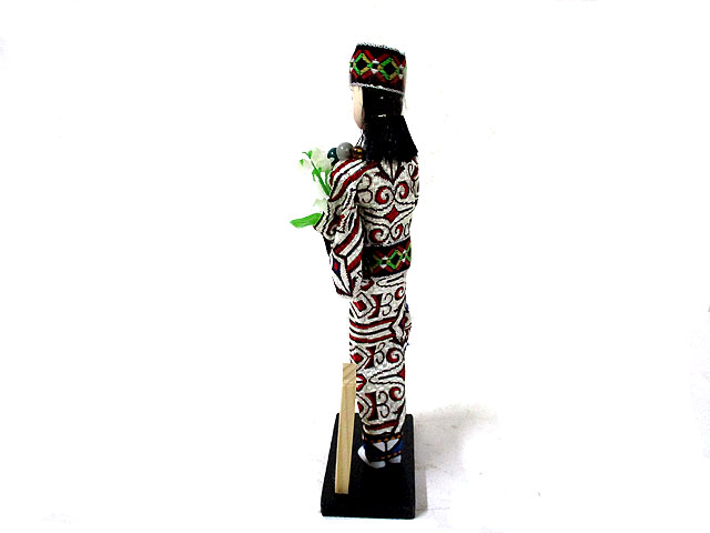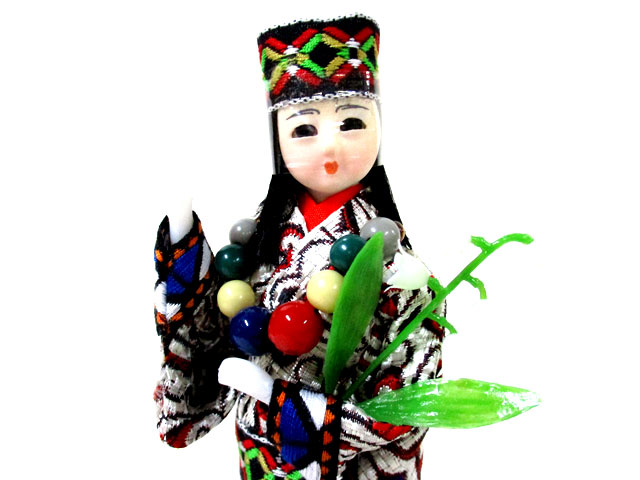 アイヌメノコがアイヌ装束にて踊りを披露している様子の人形で