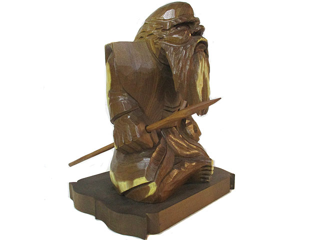 アイヌの酋長さんが槍持って座っている(あぐら)様子の木彫り品です。